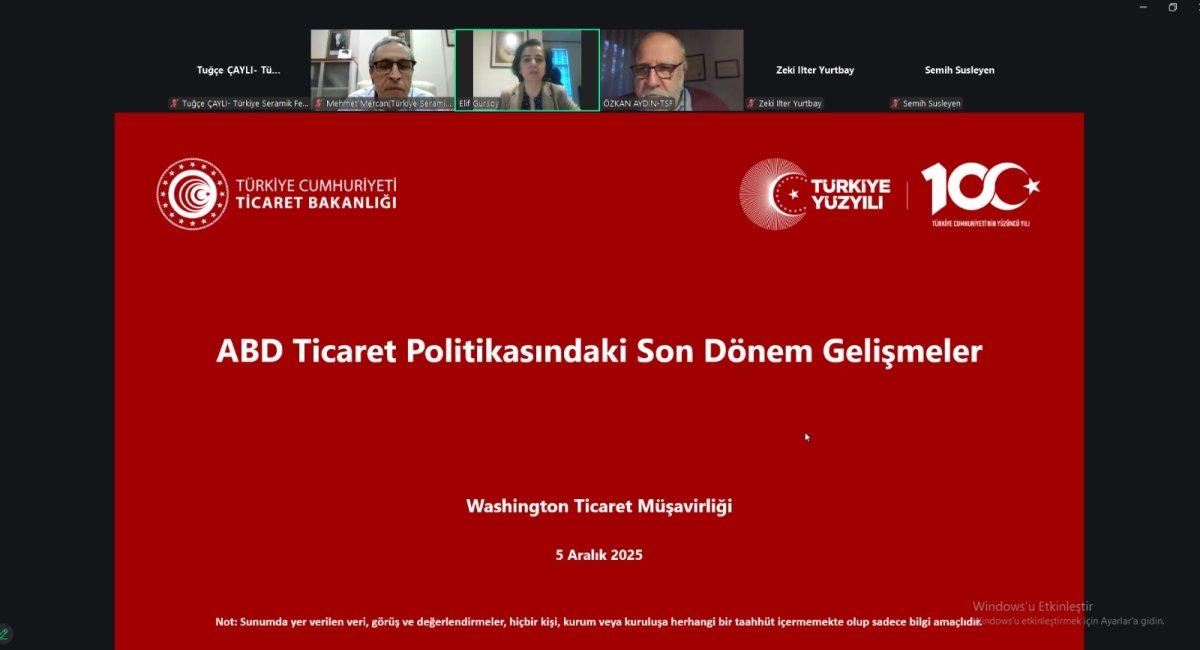 Türkiye Seramik Federasyonu olarak üyelerimizi son dönemde izlenen ABD ve AB ticaret politikaları hakkında bilgilendirmek amacıyla 5 Aralık 2025 Cuma günü “Seramik Sektörü Özelinde Türkiye-AB ve Türkiye-ABD Ticari İlişkileri ile AB-ABD Vergi Uygulamaları” konulu webinar düzenlenmiştir. Brüksel Daimi Temsilci Yardımcımız Sn. Bahar GÜÇLÜ ve Ticaret Müşavirimiz Sn. Ali Can KAHYA ile Washington Ticaret Başmüşavirimiz Sn. Elif GÜRSOY ve Ticaret Müşavirimiz Sn. Çağrı ARICI sunumlarıyla üyelerimizi bilgilendirmiş ve ardından katılımcıların sorularını yanıtlamışlardır.