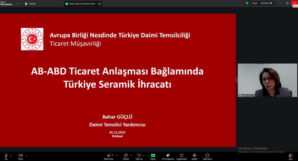 Türkiye Seramik Federasyonu olarak üyelerimizi son dönemde izlenen ABD ve AB ticaret politikaları hakkında bilgilendirmek amacıyla 5 Aralık 2025 Cuma günü “Seramik Sektörü Özelinde Türkiye-AB ve Türkiye-ABD Ticari İlişkileri ile AB-ABD Vergi Uygulamaları” konulu webinar düzenlenmiştir. Brüksel Daimi Temsilci Yardımcımız Sn. Bahar GÜÇLÜ ve Ticaret Müşavirimiz Sn. Ali Can KAHYA ile Washington Ticaret Başmüşavirimiz Sn. Elif GÜRSOY ve Ticaret Müşavirimiz Sn. Çağrı ARICI sunumlarıyla üyelerimizi bilgilendirmiş ve ardından katılımcıların sorularını yanıtlamışlardır.